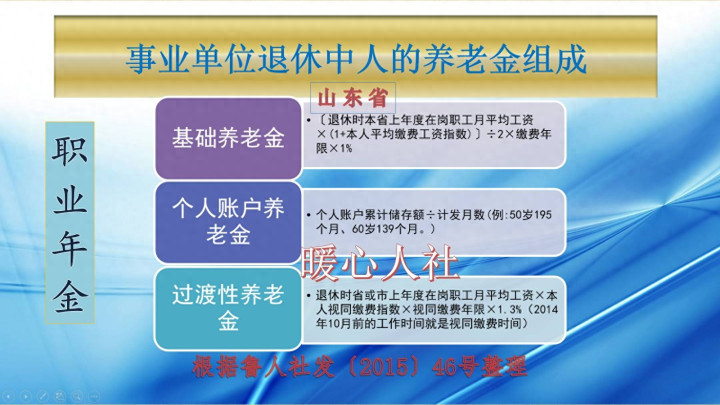 ②个人账户的待遇部分。个人账户待遇,主要包括养老保险个人账户和职业年金个人账户。养老保险个人账户是按照每月缴费基数的8%进行积累,职业年金个人账户是个人积累缴费基数的4%,用人单位积累8%。